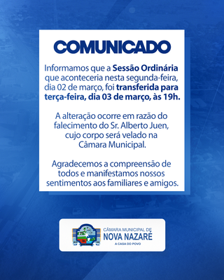 A Câmara Municipal de Nova Nazaré informa que a Sessão Ordinária prevista para segunda-feira, 02 de março, foi transferida para terça-feira, 03 de março, com início às 19h.