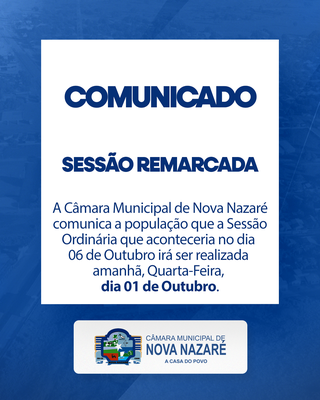 A Câmara Municipal de Nova Nazaré informa que a Sessão Ordinária, que estava prevista para acontecer dia 06 de Outubro, foi remarcada para amanhã, quarta-feira, dia 01 de Outubro.